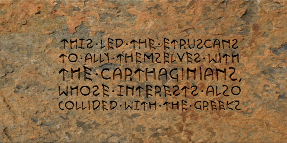 Etruria realistically simulates the real Etruscan inscriptions, their rhythm and style, the difference between letter spacing, vertical offsets, etc. for Example, for the Etruscan texts characterized by different thickness of the same characters due to the nature of their application on the stone. To simulate this in Etruria font uppercase and lowercase letters differ, these understated, but colorful differences are concluded in different forms, positions and thicknesses of these signs.